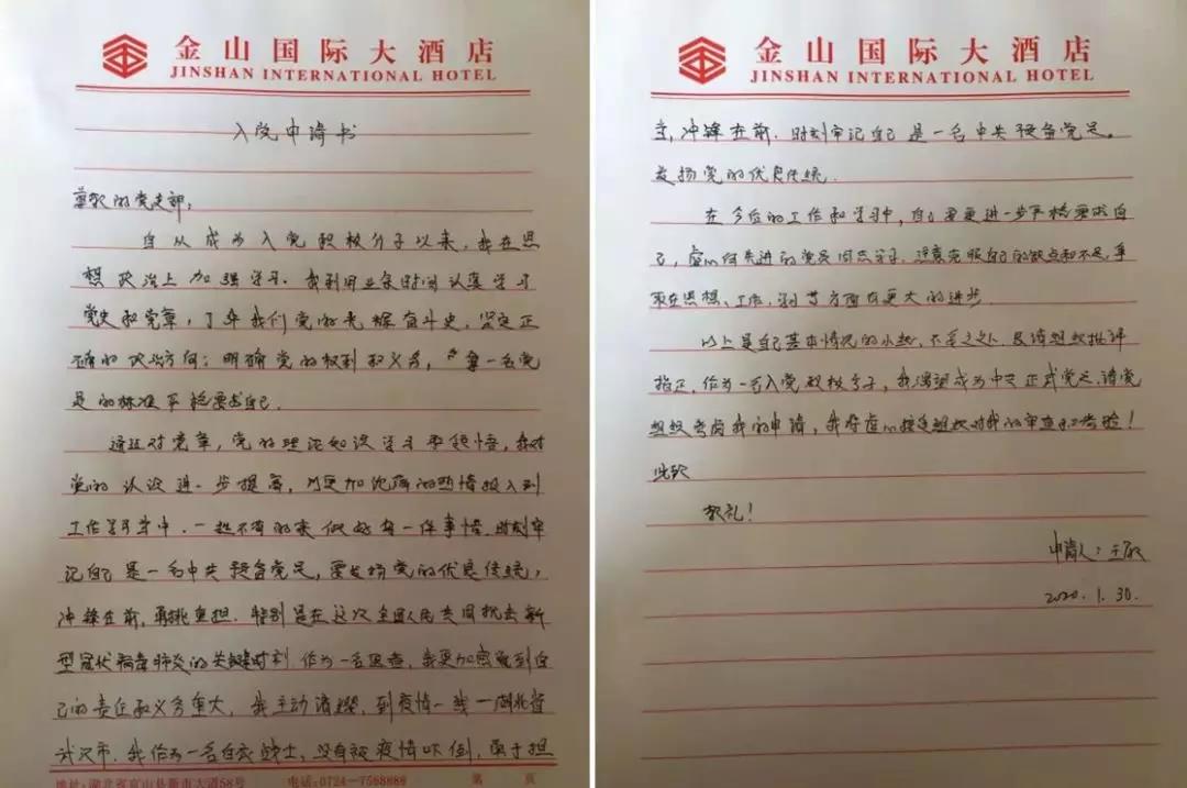 1月30日,在武漢戰(zhàn)“疫”第一線(xiàn),短短的兩天,讓青年護(hù)士王敏、王曉霞最驚訝、最感動(dòng)的就是防控疫情黨員先行,最危急的關(guān)頭、最危險(xiǎn)的地方總有共產(chǎn)黨員沖在前面,“我是黨員我先上”成為最響亮的口號(hào)。到達(dá)武漢的第二天,她們就向內(nèi)蒙古衛(wèi)健委成立的援助武漢臨時(shí)黨支部遞交了入黨申請(qǐng)書(shū)。她們表示,要在武漢防疫一線(xiàn)努力工作,向黨員同志學(xué)習(xí)、看齊,以實(shí)際行動(dòng)早日成為一名正式的共產(chǎn)黨員!
