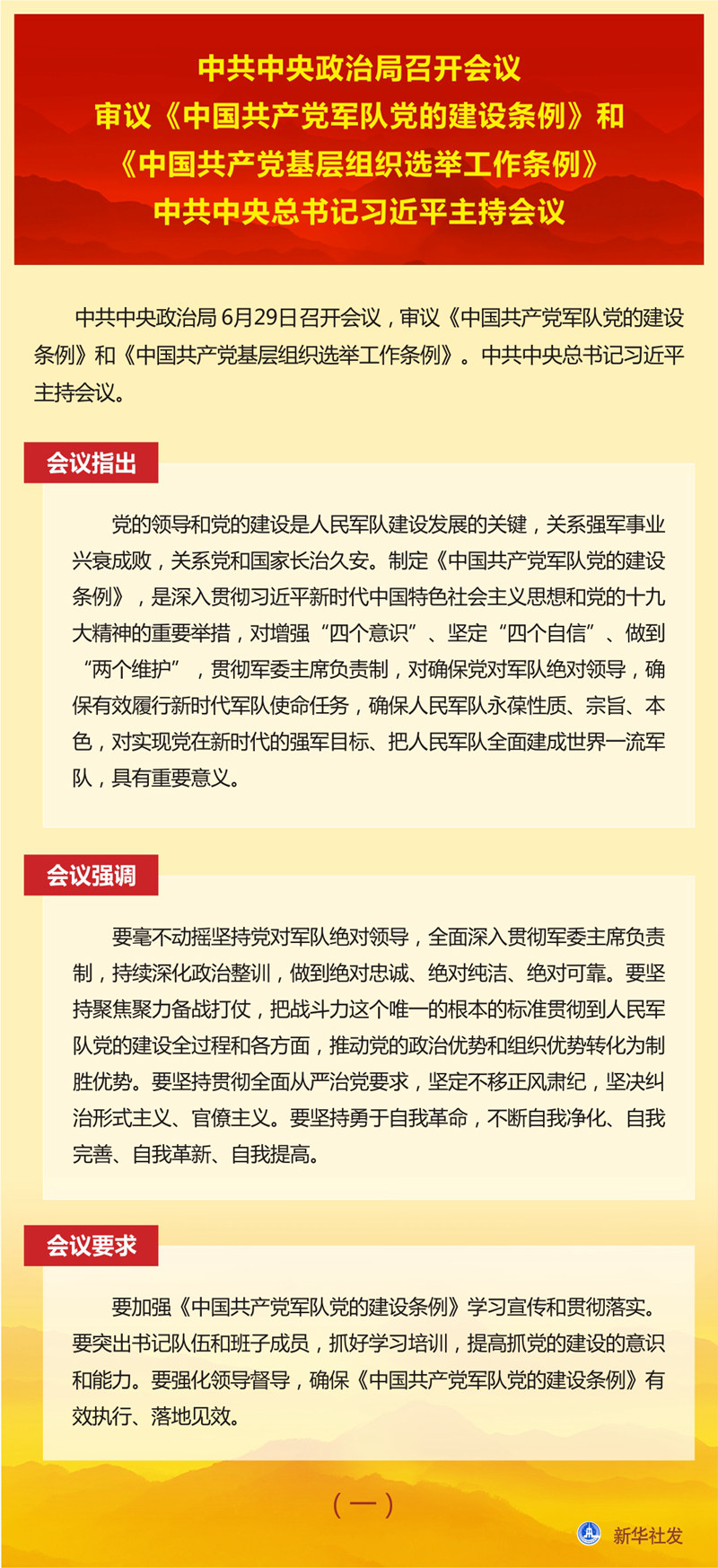 中共中央政治局召開會議 審議《中國共產(chǎn)黨軍隊黨的建設條例》和《中國共產(chǎn)黨基層組織選舉工作條例》 中共中央總書記習近平主持會議 新華社北京6月29日電 中共中央政治局6月29日召開會議,審議《中國共產(chǎn)黨軍隊黨的建設條例》和《中國共產(chǎn)黨基層組織選舉工作條例》。中共中央總書記習近平主持會議。 會議指出,黨的領導和黨的建設是人民軍隊建設發(fā)展的關鍵,關系強軍事業(yè)興衰成敗,關系黨和國家長治久安。制定《中國共產(chǎn)黨軍隊黨的建設條例》,是深入貫徹習近平新時代中國特色社會主義思想和黨的十九大精神的重要舉措,對增強“四個意識”、堅定“四個自信”、做到“兩個維護”,貫徹軍委主席負責制,對確保黨對軍隊絕對領導,確保有效履行新時代軍隊使命任務,確保人民軍隊永葆性質(zhì)、宗旨、本色,對實現(xiàn)黨在新時代的強軍目標、把人民軍隊全面建成世界一流軍隊,具有重要意義。 會議強調(diào),要毫不動搖堅持黨對軍隊絕對領導,全面深入貫徹軍委主席負責制,持續(xù)深化政治整訓,做到絕對忠誠、絕對純潔、絕對可靠。要堅持聚焦聚力備戰(zhàn)打仗,把戰(zhàn)斗力這個唯一的根本的標準貫徹到人民軍隊黨的建設全過程和各方面,推動黨的政治優(yōu)勢和組織優(yōu)勢轉(zhuǎn)化為制勝優(yōu)勢。要堅持貫徹全面從嚴治黨要求,堅定不移正風肅紀,堅決糾治形式主義、官僚主義。要堅持勇于自我革命,不斷自我凈化、自我完善、自我革新、自我提高。 會議要求,要加強《中國共產(chǎn)黨軍隊黨的建設條例》學習宣傳和貫徹落實。要突出書記隊伍和班子成員,抓好學習培訓,提高抓黨的建設的意識和能力。要強化領導督導,確?!吨袊伯a(chǎn)黨軍隊黨的建設條例》有效執(zhí)行、落地見效。 會議指出,黨的十八大以來,以習近平同志為核心的黨中央高度重視基層黨組織選舉工作,對堅持和加強黨的全面領導、貫徹執(zhí)行民主集中制、規(guī)范完善黨內(nèi)選舉制度作出一系列重大部署,有力推動了基層黨組織建設。制定和實施《中國共產(chǎn)黨基層組織選舉工作條例》,是落實黨要管黨、全面從嚴治黨要求,是發(fā)揚黨內(nèi)民主、尊重黨員民主權利、規(guī)范基層黨組織選舉的具體舉措,對增強基層黨組織政治功能和組織力,把基層黨組織建設成為宣傳黨的主張、貫徹黨的決定、領導基層治理、團結動員群眾、推動改革發(fā)展的堅強戰(zhàn)斗堡壘,鞏固黨長期執(zhí)政的組織基礎,具有重要意義。 會議強調(diào),要嚴格執(zhí)行選舉制度規(guī)定,提高黨內(nèi)選舉質(zhì)量,保障黨章賦予的黨員權利,增強黨的意識、政治意識、規(guī)矩意識。要嚴格代表資格條件,確保選出合格的代表。要合理分配代表名額,優(yōu)化代表結構,確保生產(chǎn)和工作一線代表比例。要按照德才兼?zhèn)?、以德為先和班子結構合理的原則提名委員候選人。要堅持教育在先、警示在先、預防在先,嚴肅政治紀律、組織紀律和換屆紀律,確保選舉風清氣正。 會議要求,各級黨委要加強對《中國共產(chǎn)黨基層組織選舉工作條例》實施的組織領導,嚴格落實黨委主體責任,加強謀劃,精心組織,全程把關。要貫徹執(zhí)行民主集中制,教育引導黨員和代表正確行使民主權利,保證選舉工作平穩(wěn)有序。要強化基層黨組織書記和黨務骨干培訓,提升工作規(guī)范化水平。要加強督促落實,確?!吨袊伯a(chǎn)黨基層組織選舉工作條例》各項規(guī)定要求落到實處。 會議還研究了其他事項。 |