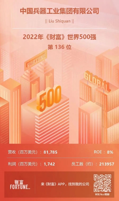 兵器工業(yè)集團(tuán)位列2022年《財(cái)富》世界500強(qiáng)第136位 |