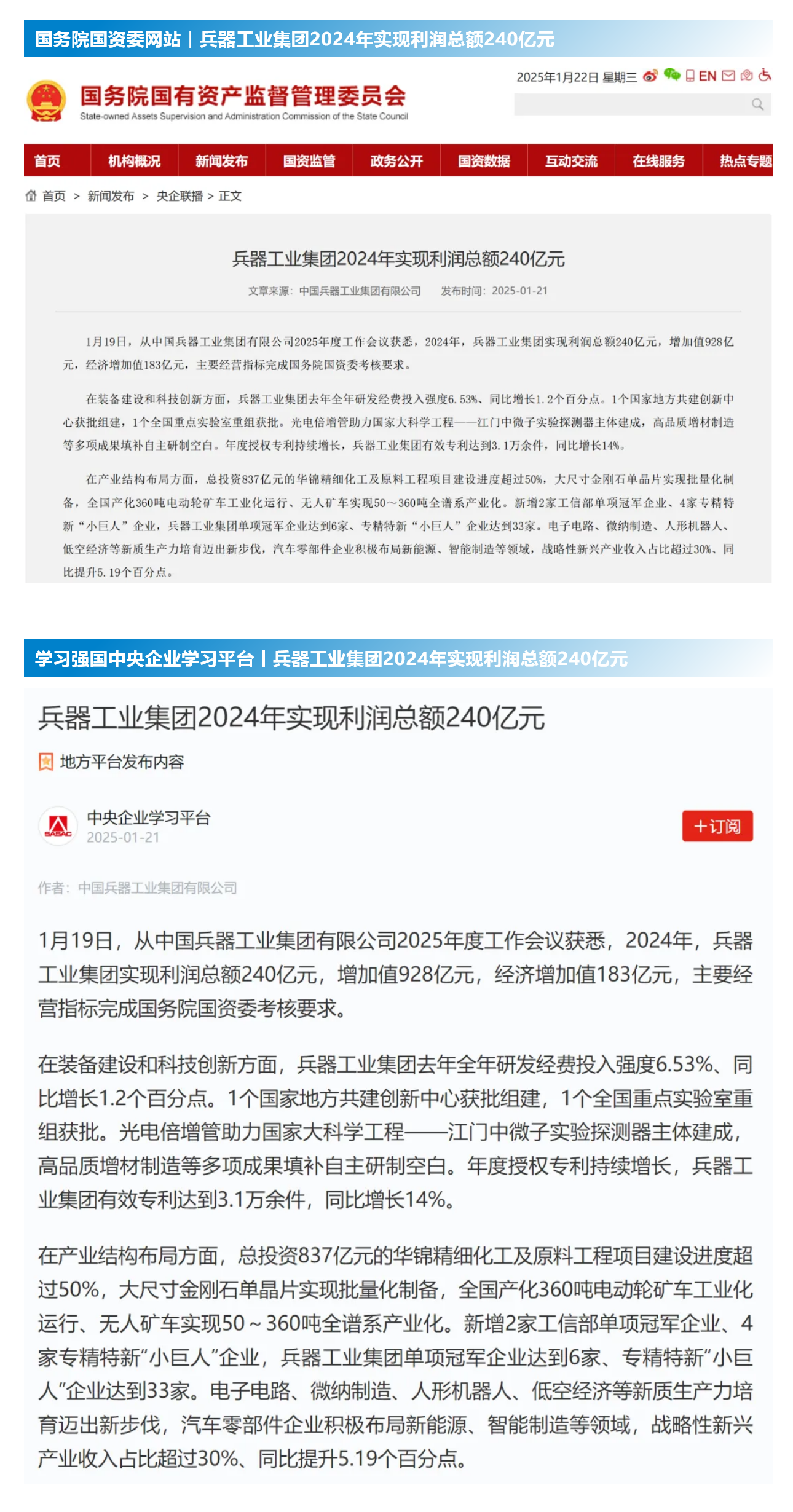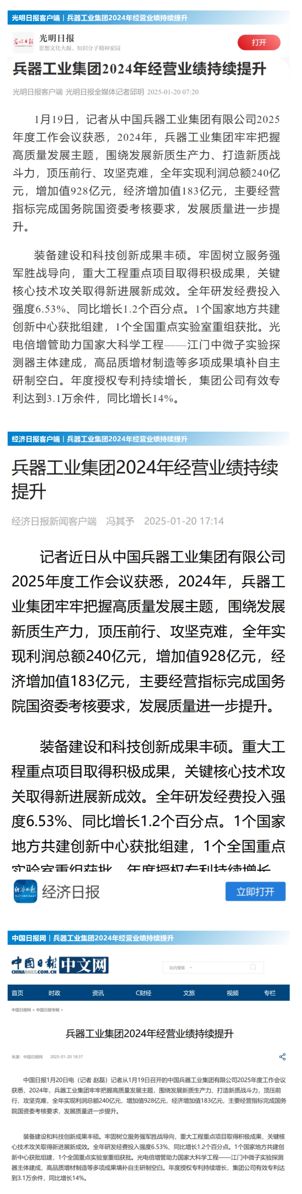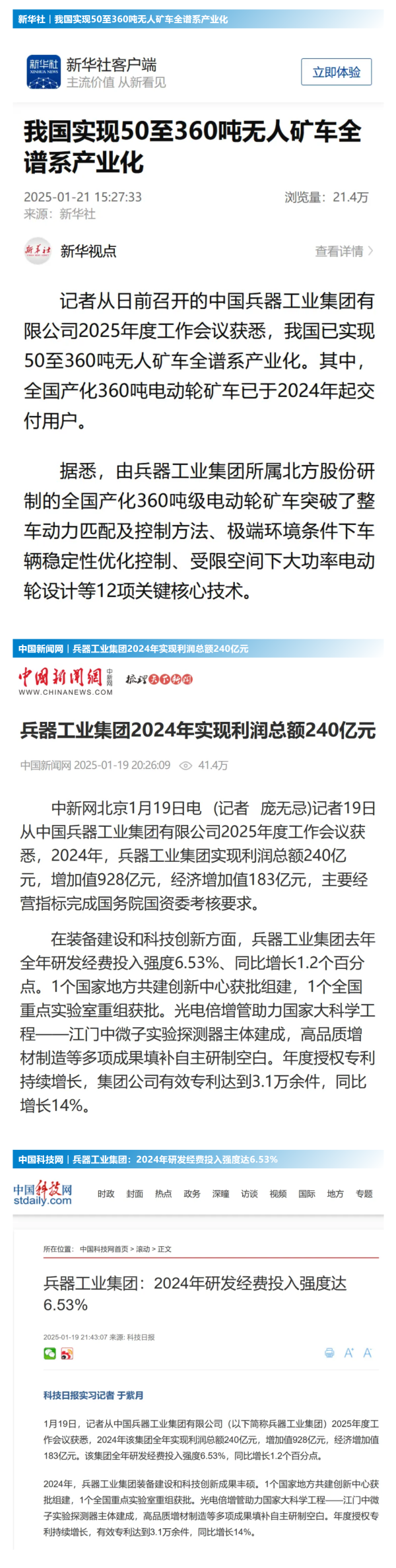 1月19日至20日,中國(guó)兵器工業(yè)集團(tuán)有限公司2025年度工作會(huì)議在京召開(kāi),會(huì)議總結(jié)2024年工作,分析形勢(shì)任務(wù),明確工作思路,部署2025年工作。 集團(tuán)公司2024年取得的成績(jī)及下一步重點(diǎn)工作受到社會(huì)媒體廣泛關(guān)注。新華社、中國(guó)新聞網(wǎng)、中國(guó)科技網(wǎng)、光明日?qǐng)?bào)客戶(hù)端、經(jīng)濟(jì)日?qǐng)?bào)客戶(hù)端、中國(guó)日?qǐng)?bào)網(wǎng)、國(guó)務(wù)院國(guó)資委網(wǎng)站、學(xué)習(xí)強(qiáng)國(guó)中央企業(yè)學(xué)習(xí)平臺(tái)、新浪網(wǎng)、網(wǎng)易網(wǎng)、搜狐網(wǎng)、騰訊網(wǎng)、鳳凰網(wǎng)等中央主流媒體、國(guó)家部委網(wǎng)站及知名網(wǎng)絡(luò)媒體對(duì)集團(tuán)公司2025年度工作會(huì)議進(jìn)行了報(bào)道,重點(diǎn)關(guān)注集團(tuán)公司經(jīng)營(yíng)業(yè)績(jī)、科技創(chuàng)新、產(chǎn)業(yè)結(jié)構(gòu)布局優(yōu)化等情況。其中,新華社以《我國(guó)實(shí)現(xiàn)50至360噸無(wú)人礦車(chē)全譜系產(chǎn)業(yè)化》為題,重點(diǎn)報(bào)道了集團(tuán)公司在推動(dòng)智能制造水平提升方面取得的成效;中國(guó)新聞網(wǎng)、光明日?qǐng)?bào)客戶(hù)端、經(jīng)濟(jì)日?qǐng)?bào)客戶(hù)端、中國(guó)日?qǐng)?bào)網(wǎng)等就集團(tuán)公司2024年度經(jīng)營(yíng)業(yè)績(jī)及各項(xiàng)工作取得的成果進(jìn)行報(bào)道;中國(guó)科技網(wǎng)著重報(bào)道了集團(tuán)公司在科技創(chuàng)新和優(yōu)化產(chǎn)業(yè)結(jié)構(gòu)布局方面的最新進(jìn)展。集團(tuán)公司門(mén)戶(hù)網(wǎng)站、微信公眾號(hào)、微博等新媒體平臺(tái)以及《中國(guó)兵工報(bào)》也對(duì)集團(tuán)公司工作會(huì)議進(jìn)行了及時(shí)報(bào)道,各成員單位紛紛對(duì)相關(guān)內(nèi)容進(jìn)行轉(zhuǎn)載,引發(fā)全系統(tǒng)關(guān)注。 集團(tuán)公司職工及廣大網(wǎng)友熱議工作會(huì) “2025年工作會(huì)為我們指明了發(fā)展方向、明確了奮斗目標(biāo),面對(duì)全新的機(jī)遇和挑戰(zhàn),作為兵工人深感責(zé)任重大?!?/p> “科技是第一生產(chǎn)力,一定要以科技創(chuàng)新引領(lǐng)新質(zhì)生產(chǎn)力發(fā)展,為高質(zhì)量發(fā)展提供支撐?!?/p> “把各項(xiàng)工作做深、做實(shí)、做細(xì),努力為集團(tuán)公司高質(zhì)量發(fā)展添磚加瓦。” “2024年中國(guó)兵器展示了大國(guó)重器,祝新的一年中再創(chuàng)輝煌!” |